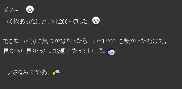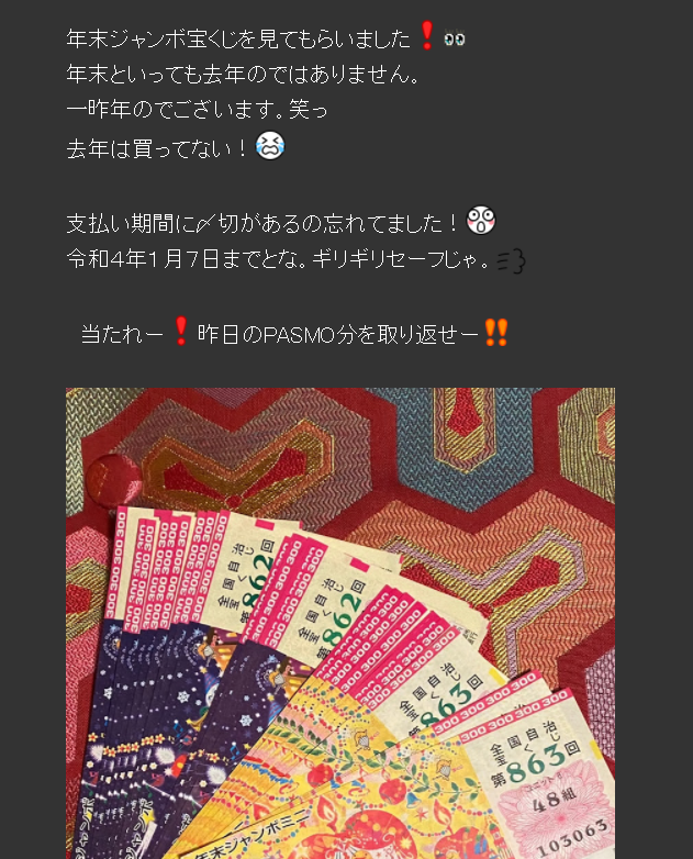 当選金額は、40枚換金して“1,200円”とあまり芳しくない結果。しかし戸田さんは「〆切に気づかなかったらこの1,200円も無かったわけで。良かった良かった」と前向きに捉えたコメントを残しています。最後に「地道にやっていこう」と投稿を締めくくったのでした。