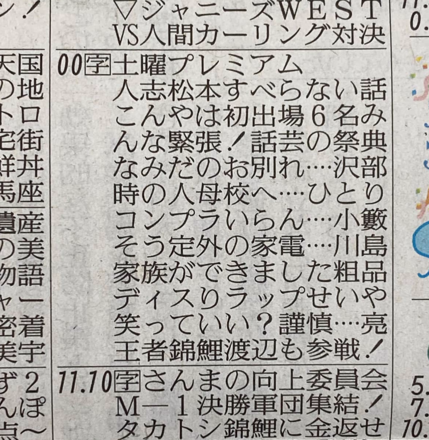以前、新聞朝刊のテレビ欄に掲載された、トークバラエティ番組「人志松本のすべらない話」(フジテレビ系)のラテ欄に注目が集まっています。なぜなら、粋な縦読みメッセージが隠されていたというのです。 この日、朝刊の同番組のラテ欄には、「土曜プレミアム 人志松本すべらない話」に続いてこんな言葉が並びました。