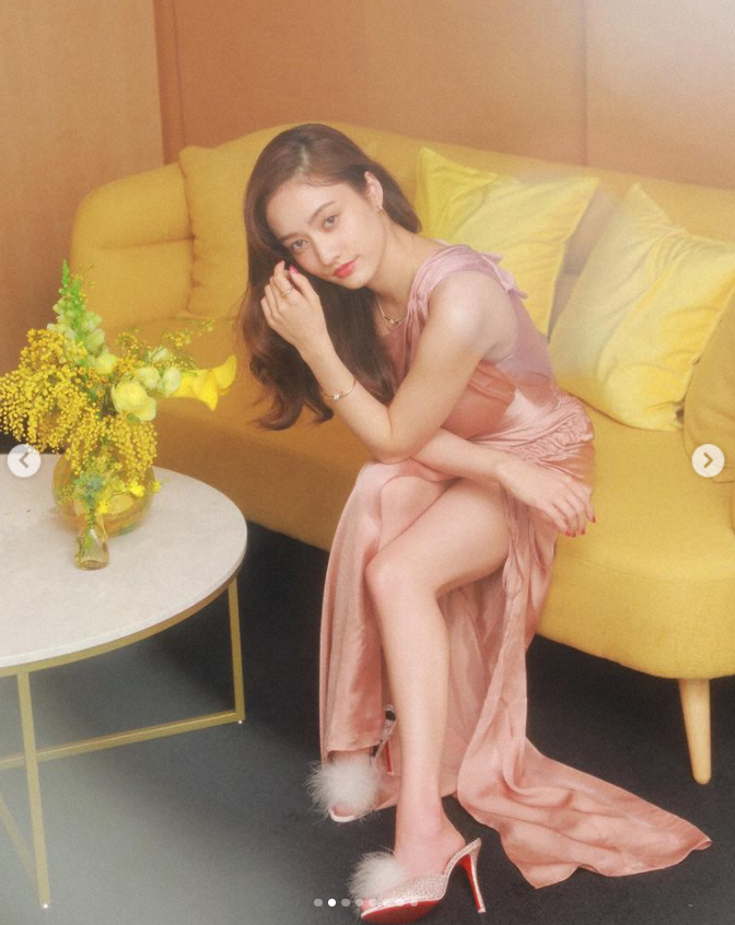 谷は以前、インスタグラムでエレガントなドレス姿を公開しました。これは高級宝飾ブランドの記念イベントで撮影した写真のようでした。ピンクのワンショルダーのドレスで、スカートの横には足の付け根近くまでスリットが入っています。ソファに腰掛けた写真ではスリットが大きく開き、ナマ足が顔を見せています。