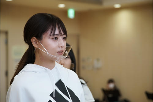 次に、両足を開いた状態で腰を落とし、ヒップを左右に移動させる「スライドスクワット」に移行し、「モモ上げ」では、その激しい脚の動きに合わせて、おへソを見せながら、その上の衣装越しにもEバ〇トが上下左右に大暴れしているのがわかるといった艶サービスショットを見せていました。