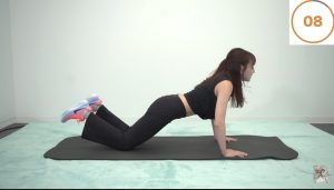 「これはキツかったですね」「頑張って下さい」など、副音声のナレーションで自身にエールを送る形で番組は進行し、まず両膝を床につけた状態で腕立て伏せを20秒間行いました。胸から腕にたまった乳酸を解消しようと、休憩中の10秒間に腕をグルグルと回し、艶やかにワキを披露しました。