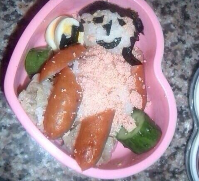 ハイヒール・モモコいわく「ピンクのワンピースの女の子」だそうです。しかし、どう考えてもそうは見えません。むしろ恐怖さえ覚えます。ネット上では「友達の前でこんなお弁当を広げる娘が可哀想」と娘を心配する声が多かったですが、当の娘もちゃんと「バラバラ〇体弁当みたい」とツッコんだそうです。そこはさすがに大阪人の気質を感じます。