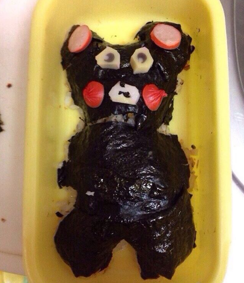 さらに、みんなが大好きくまモン弁当まで。これこそ焼け焦げた〇体みたいですが、味はおいしかったようで、娘は喜んで食べていたんだとか。こちらのふなっしー弁当はそこそこいけるクオリティです。