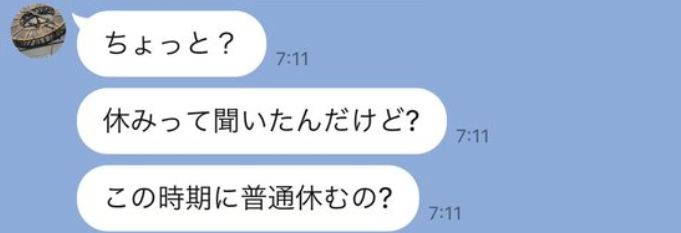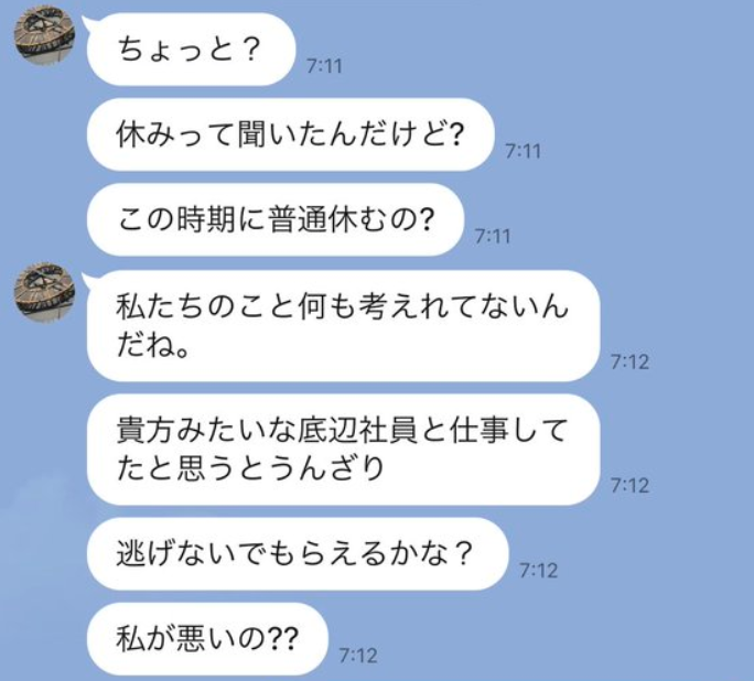 欠勤と聞きつけた“BBA”と称する会社のおばさんからLINEが入ります。