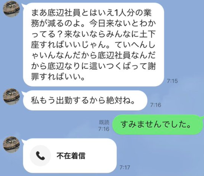 体調を気遣うどころか、欠勤を責めるような内容ですね。こんな時は優しい一言を掛ける大人でありたいものです。