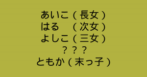 問題文に「5人兄妹」とあります。挙げられている4人は全員が女性のため、兄妹である為には5人目は「男性」である必要があります。