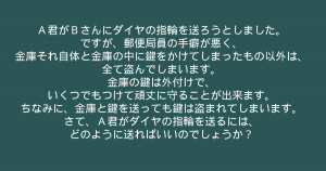 「1、A君は金庫の中にダイヤの指輪を入れて、鍵Aをかけた上でBさんに送る。