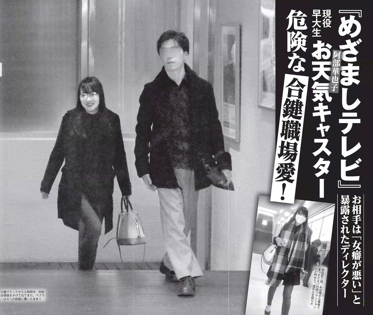 また阿部は過去のフジのディレクターと半同棲の熱愛も発覚したりなどの出来事から、この栄転は余計に不可解だといい「阿部は大学時代にナンパ目的の出会いバーに出向き、テキーラを何杯も煽った末、初対面の男と店内で10分もの濃厚キスに及んだことが暴露されています。朝番組とは真逆な夜型人間であり、清廉さが求められる〝朝の顔〟は相応しくありません。本来ならば番組を卒業するレベルの出来事ですが、栄転という真逆の処遇になっている辺り、いかにフジが彼女を贔屓にしているかが分かります」とも暴露されています。