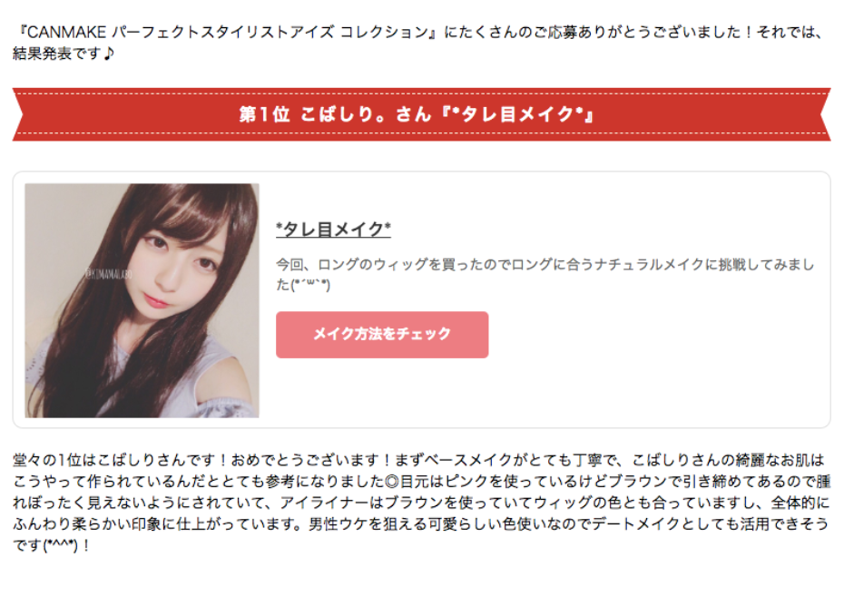 CAN MAKEの人気アイシャドウ「パーフェクトスタイリストアイズ」を使用した「パーフェクトスタイリストアイズコレクション」で1位に輝いているのがこばしり。さんです。