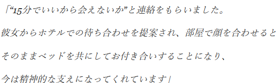 初対面はホテルの部屋、そのままベッドを共にして交際に発展というから驚きです。