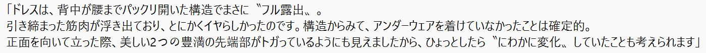 その理由は、白いドレス越しに下着のラインが見えなかったため、何もつけていないのでは?という声が上がったのです。