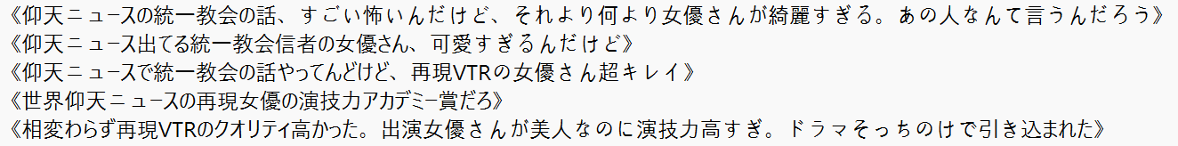 この日番組では「日本を騒がせた衝撃ニュースの真実に迫るSP」というテーマで、実際に「統一教会」に入信した女子高校生のエピソードが伝えられ、入信から高額な印鑑を売る〝霊能者〟になるまでを描き、合同結婚式や母の自殺など、壮絶な人生を再現VTRにて放送されました。