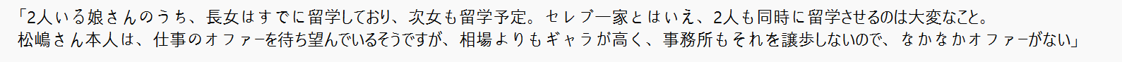 松嶋は、今年1月期のテレビ朝日系ドラマ『となりのチカラ』に出演したものの、以降は出演作が決まっている様子がありません。