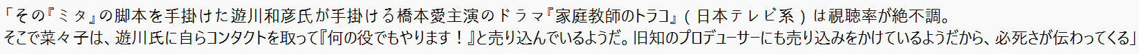 ここまでくれば、『ミタ』をオマージュしてシリーズ化されている『家政婦のミタゾノ』(テレビ朝日系)で、主演のTOKIO・松岡昌宏との共演を菜々子にオファーしても快諾してくれるかもしれないという憶測も立っています。