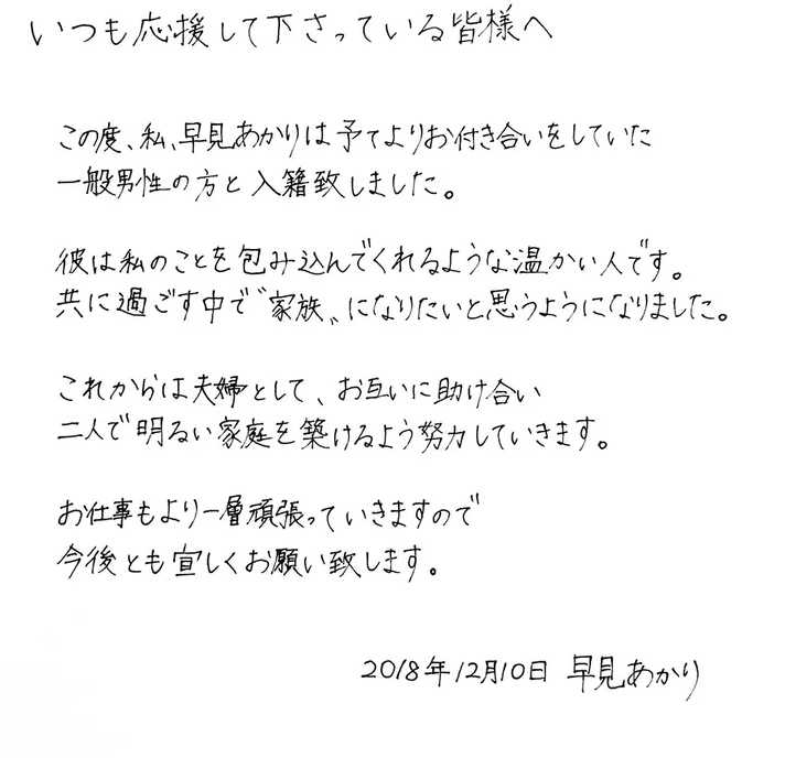 この度、私、早見あかりは予てよりお付き合いをしていた一般男性の方と入籍致しました。
