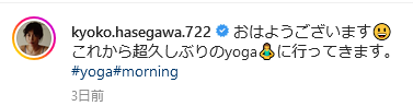 インスタグラムを更新した長谷川さんはオフ日のこの日、朝からヨガへ出かけることを報告しました。
