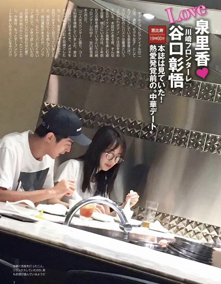2017年に、週刊誌によりサッカーJリーグ・川崎フロンターレに所属し、日本代表にも選出されている谷口彰悟(選手との熱愛が報道されました。記事によると2人は、2015年に友人を介して交際がスタートし、谷口選手が泉さんにゾッコンであるとのことです。その後、2020年には同棲報道も出ており、記者が谷口さんに「結婚の予定はありますか?」とインタビューをしたところ、谷口さんは「ないです。ないです。」と、回答しましたが、現在までに破局報道は出ておらず、2人の仕事のタイミング次第では、結婚の可能性もあるのではないかと推測できます。