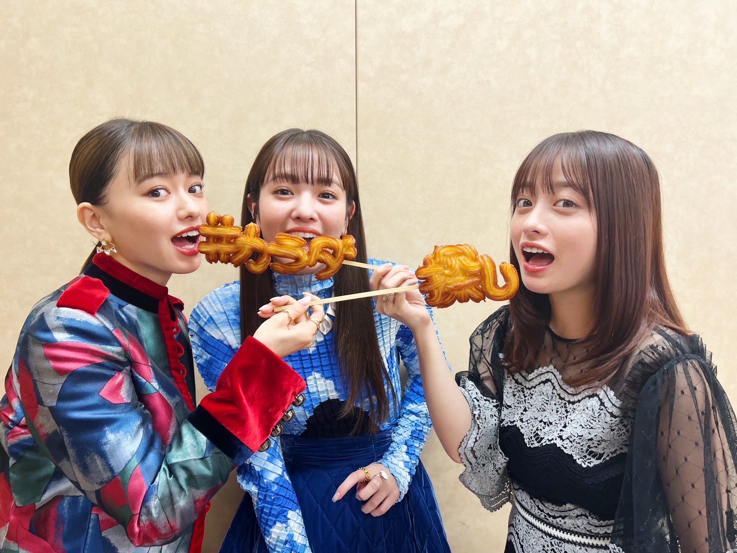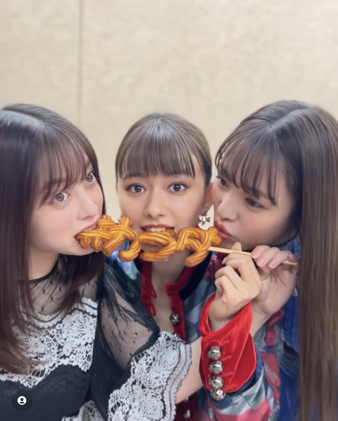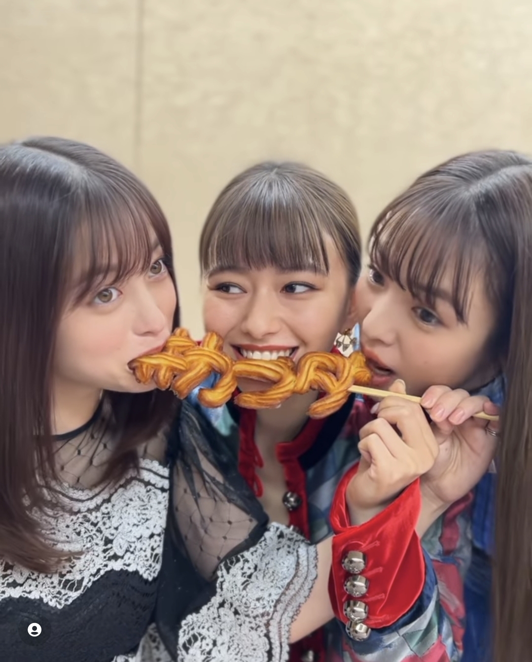 同世代ということもあり、基本ずっと喋っているという3人。これまでにも撮影のオフショットやイベントでの仲の良い様子を見せていました。今回は、公開記念舞台あいさつで集まった時の様子を投稿。山本は「とっても幸せな1日でした。環奈と真悠と常に距離近めでした笑笑 みーんなでいるとわちゃわちゃで楽しいんです。ほんっとうに」と楽しそうにひとつのチュロスを3人で食べる動画アップ。