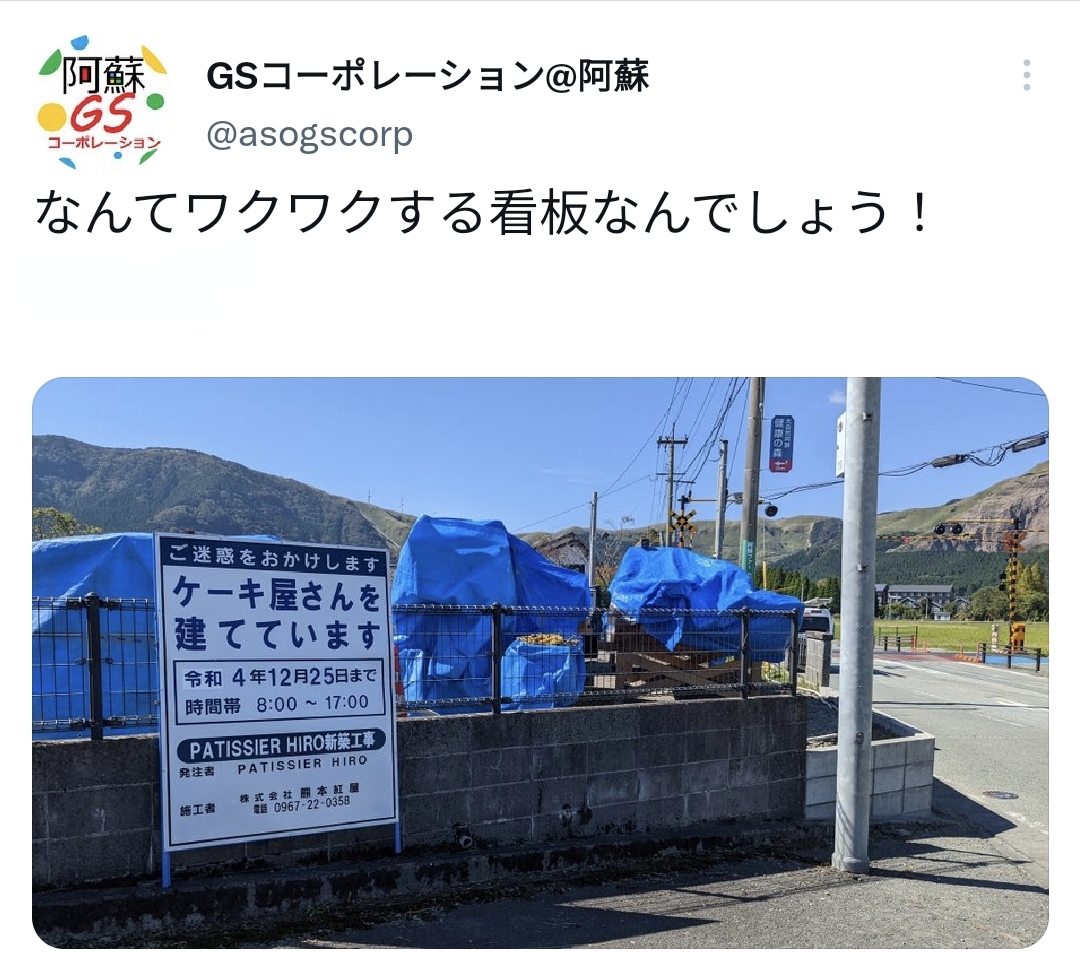 話題の看板は、同市の企業「熊本紅屋」が管理するもので、「ケーキ屋さんを建てています」という微笑ましいフレーズは同社の社長が思いついたものだそうです。工事の完了予定日がクリスマスとなっているのは、特にねらいがあったワケではないと語っていました。