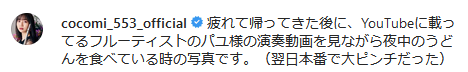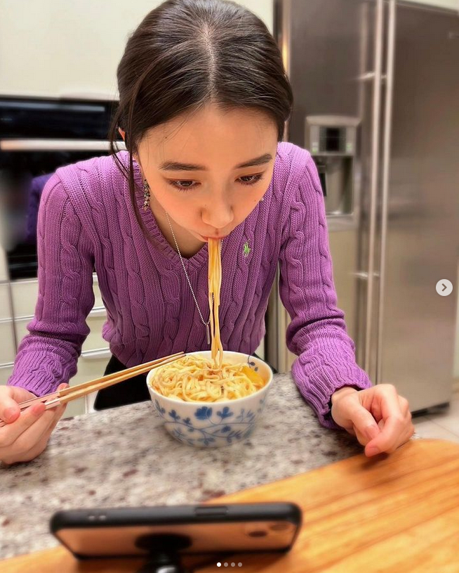 先日、インスタグラムに投稿したのは夜食でうどんを食べている様子です。