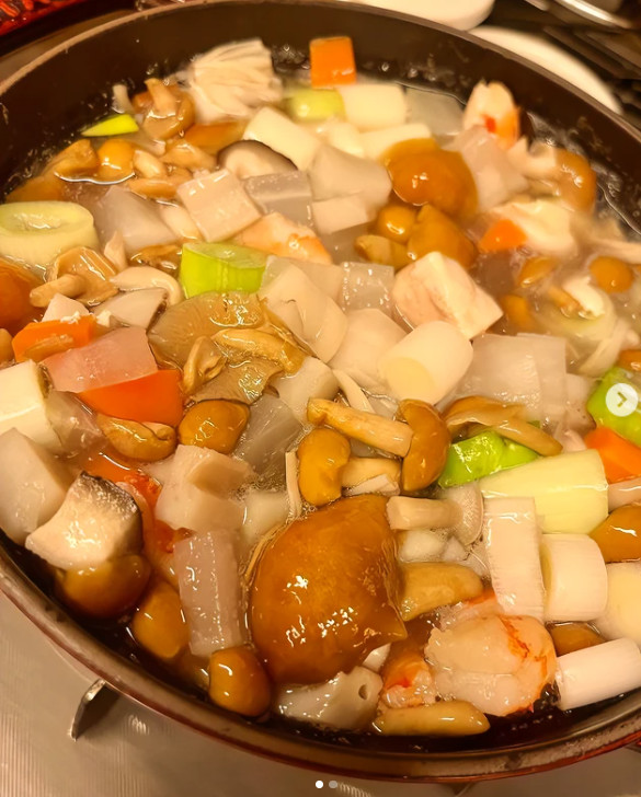 「体力アップできそうな、なめこのっぺい汁!笑 根野菜たっぷりと、ネギ、生姜、鶏肉!エビは昨日の残り」また、「2枚目はいただいた大きい花梨!ハチミツで漬けます!」と、娘・Cocomiさんの症状を考慮したメニューでしたが、写真を見ると…