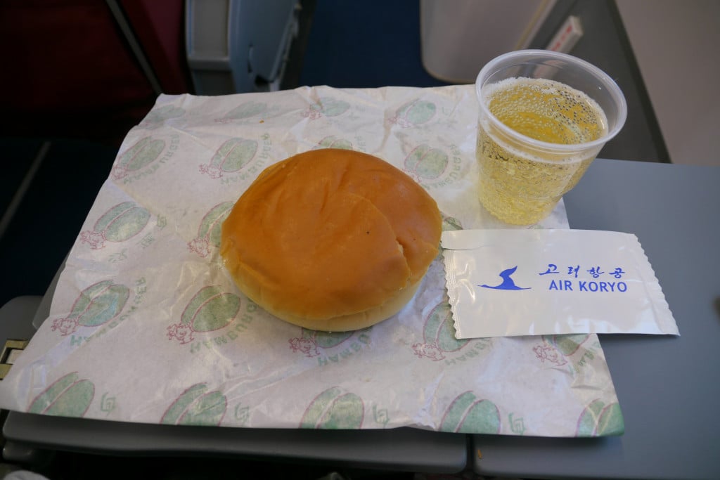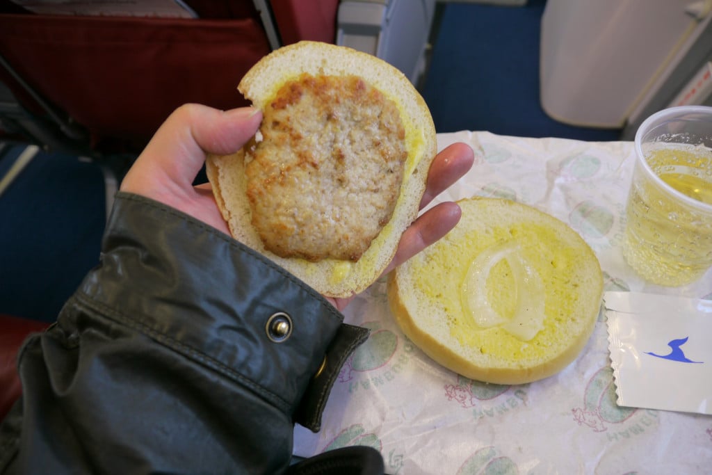 飛行機が離陸し、しばらくすると機内食が運ばれてきたようで、メニューはハンバーガーでした。ハンバーガーは紙でしっかり包装されています。シンプルなハンバーガーの中には、パティと玉ねぎスライス、そしてまったりテイストのマスタードのようなソースが塗られていました。クドウが食べた感想はパンはぱさぱさでジューシーさは皆無、「ハンバーガーとして残念な出来」だったようです。しかし、北朝鮮は食べ物に困っている人たちが多くいると聞くため、最後まで有難く食べたと報告していました。