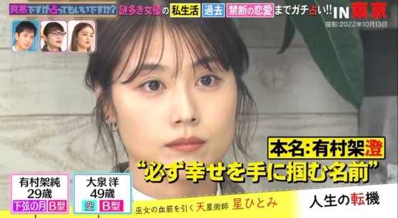 占い師から「元々の字画がめちゃくちゃ良くて、必ず幸せを掴むっていうお名前」と説明されると、番組のテロップに「本名:有村架澄」と表示され、有村さんは「漢字が1文字だけ違うんですよ」と告白しつつ「親に感謝」とにっこりしました。一方、芸名について『試練を引っ張る』から単純な平和な人生は歩まないと指摘されると、小さくうんうんとうなずいていました。
