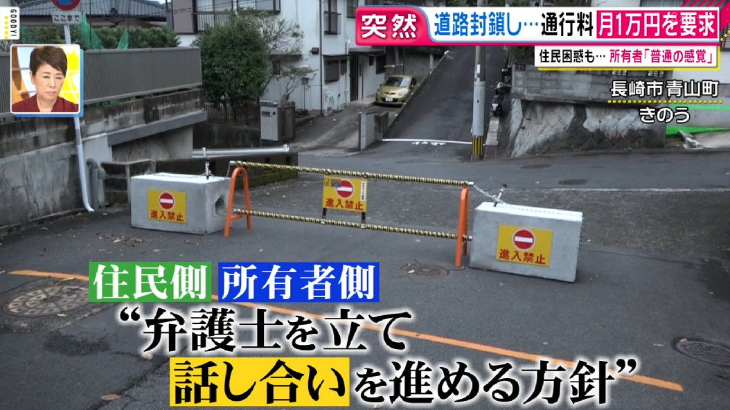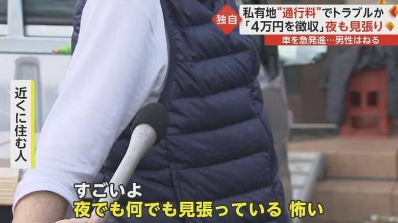 近くの住人は『すごいよ、夜でも何でも見張っている。怖い。近づかないよ、みんな。俺も2、3回怒鳴られたことある。スピーカー越しとかで「見てるぞ」みたいな「ここ通るな」みたいに言われたりする 』と遠回りしなけらばいけなく、通行するには、所定の通行料金を支払わなければならず、これまでも迂回路が渋滞するなど住民を悩ませてきました。