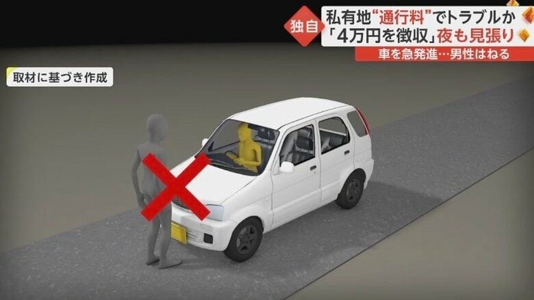 私有地の道路通行をめぐる金銭トラブルで、男性に車を急発進させ衝突した疑いで、70歳の男が逮捕されました。 各テレビ局は4年前にこの問題を取材していて、当時の通行料は1万円だったが、現在は4万円。4倍に値上がりしていました。