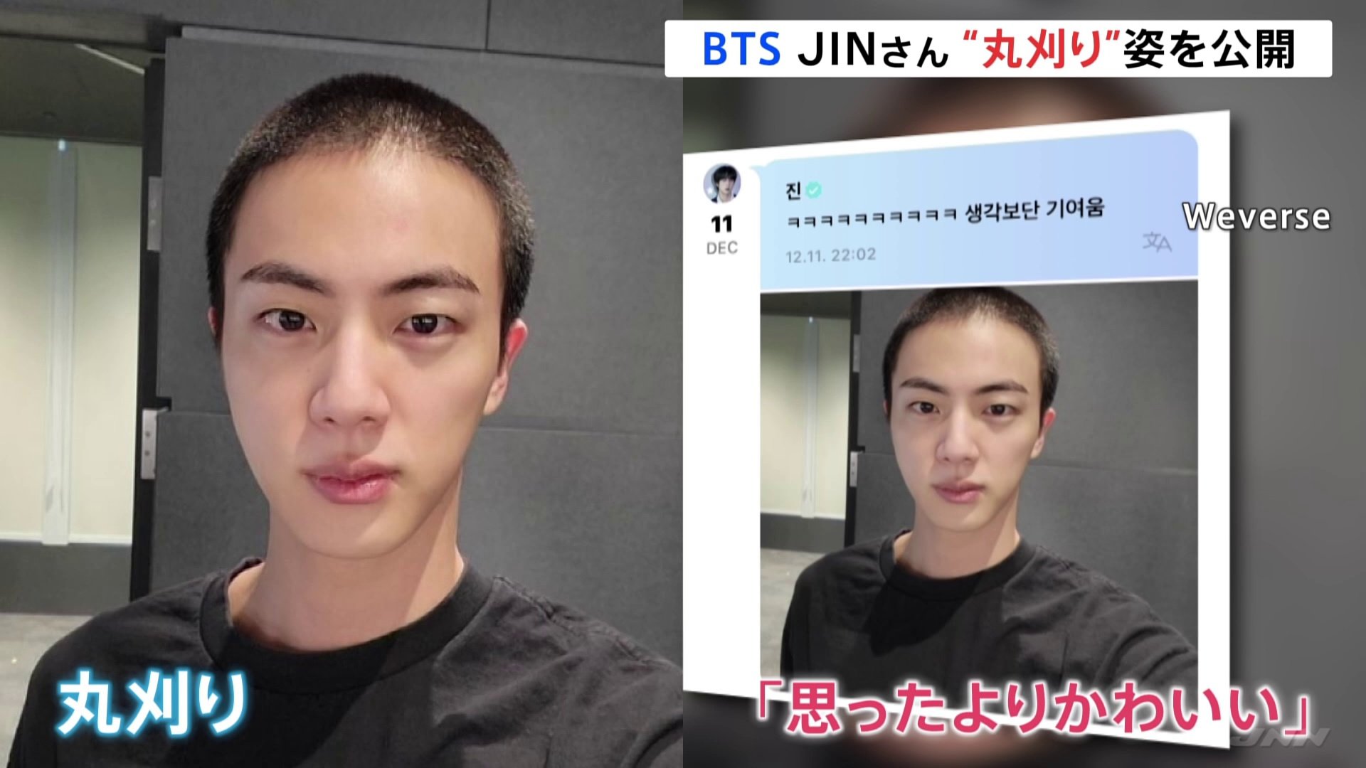 また今回同時に公開されたJINさんの坊主に黒のTシャツ姿にファンたちからは多くの絶賛の声が上がっており