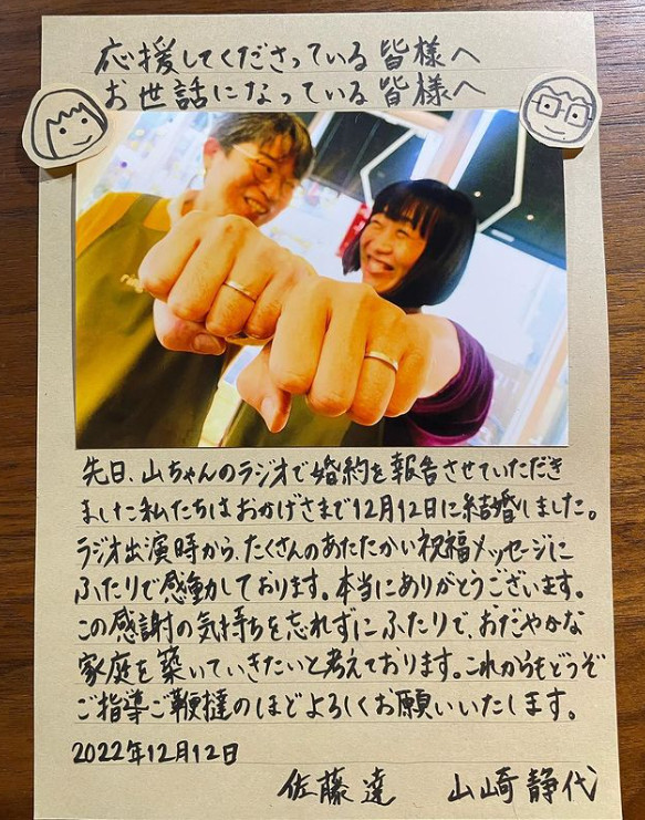 「先日、山ちゃんのラジオで婚約を報告させていただきました私たちはおかげさまで12月12日に結婚しました。ラジオ出演時から、たくさんのあたたかい祝福メッセージにふたりで感動しております。本当にありがとうございます。この感謝の気持ちを忘れずにふたりで、おだやかな家庭を築いていきたいと考えております。これからもどうぞご指導ご鞭撻のほどよろしくお願いいたします」