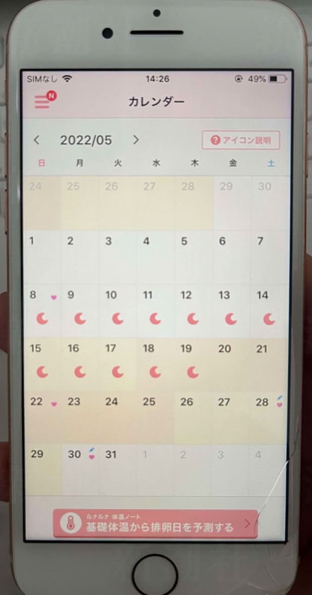 旦那との行為は2022年5月8日(日)と、2022年5月22日(日)の2日、一方で、不倫相手との行為は2022年5月28日(土)と、2022年5月30日(月)の2日であり、平日にも会っていることが伺えます。このスクリーンショットには生理を表す三日月マークも記されていますが、2022年5月8日〜2022年5月19日と、およそ12日間にもわたって生理が続いていることも判明しました。