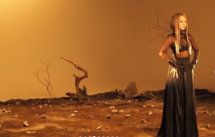 今回のショットは1月18日にリリースされる、Music & Live Package「WINGS」の撮影オフショットが多く公開され、前回のまるで女神の様な、人魚姫の様な姿とは真逆の、オレンジの照明で荒野をイメージされるような背景に後ろ髪はショートヘアにして、ボディラインが強調されるシースルートップからはセ〇シーにガーターブラを着用し、まるで悪の女王様が履いていそうな黒のロングスカートを着用している姿が、セ〇シーでかっっこ良すぎると話題です。