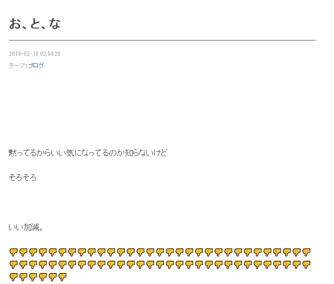 以前にこちらの事務所に所属していた花田優一は、この事実を知ったのか2月18日に「お、と、な」のタイトルでブログを更新。「黙ってるからいい気になってるのか知らないけど そろそろ いい加減」と綴り、ブーイングの意味を示す親指を下げた絵文字を68個も投稿しています。