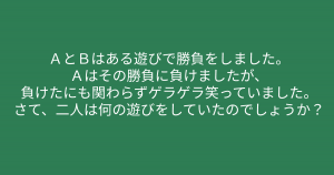 ”AとBはある遊びで勝負をしました。” ある部分に注目して解いてみましょう! 今回ご紹介するのは脳トレクイズです。 問題 AとBはある遊びで勝負をしました。 Aはその勝負に負けましたが、負けたにも関わらずゲラゲラ笑っていました。 さて、二人は何の遊びをしていたのでしょうか? Google ADVERTISEMENT Google あなたはわかりましたか? それでは答え合わせに行きましょう! Google 答えは、、、「にらめっこ」 ADVERTISEMENT 「にらめっこ」は笑ったら負けです。Aはゲラゲラ笑って負けてしまいました。 Google あなたは間違えずに解けたでしょうか! ADVERTISEMENT Google [著作権者VONVON /無断コピー、無断転載および再配布禁止(違反時の法的措置)