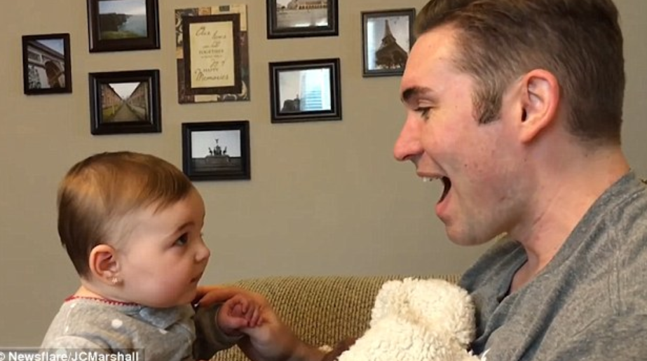 動画の始まりは赤ちゃんとそのパパが「いないいないばぁ」をして遊ぶ様子から始まります。