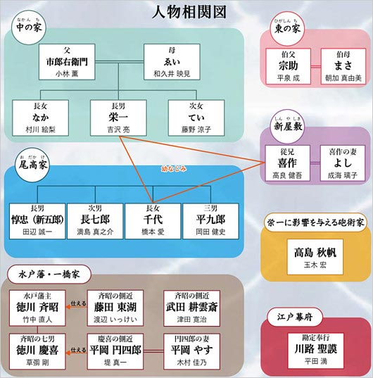 栄一より 3年早く水戸藩主・徳川斉昭(竹中直人)の七男として生まれ、一橋家を継ぎ、徳川幕府最後の将軍となった 徳川慶喜。側近・平岡円四郎(堤真一)の目利きで栄一と出会い、財政改革に手腕を発揮した栄一を重用します。