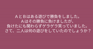 ”Aはその勝負に負けましたが、、、” 問題文をよく読んで解いてみましょう 今回ご紹介するのは脳トレクイズです。 問題 AとBはある遊びで勝負をしました。 Aはその勝負に負けましたが、負けたにも関わらずゲラゲラ笑っていました。 さて、二人は何の遊びをしていたのでしょうか? Google ADVERTISEMENT Google あなたはわかりましたか? それでは答え合わせに行きましょう! Google 答えは、、、「にらめっこ」 ADVERTISEMENT 「にらめっこ」は笑ったら負けです。Aはゲラゲラ笑って負けてしまいました。 Google あなたは間違えずに解けたでしょうか! ADVERTISEMENT Google [著作権者VONVON /無断コピー、無断転載および再配布禁止(違反時の法的措置)]