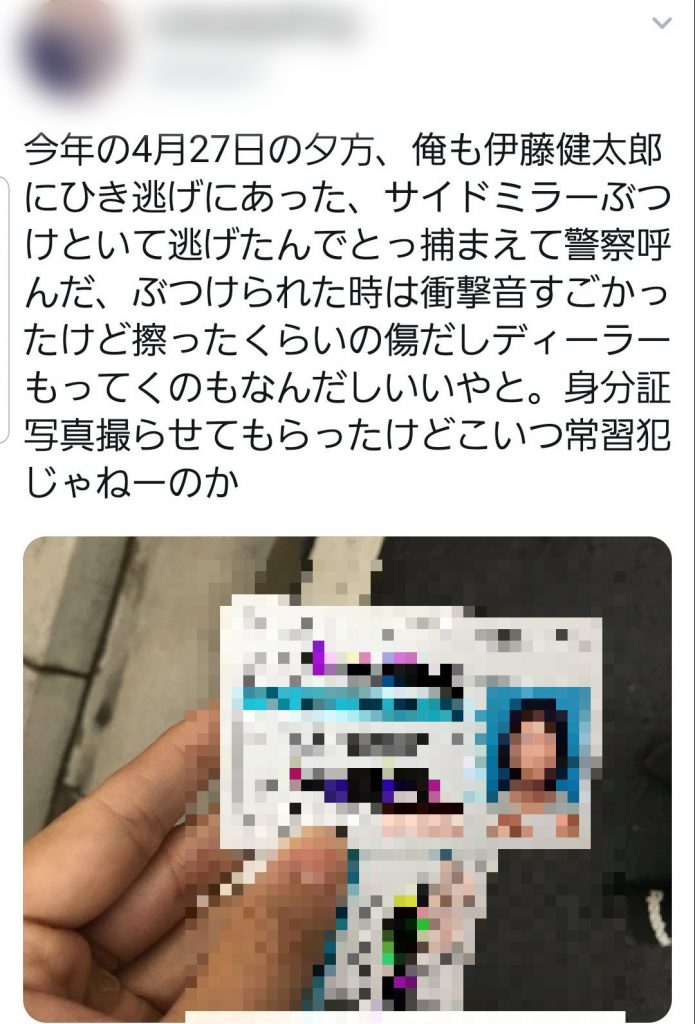 こちらが実際の投稿ですが、該当のユーザーいわく4月27日の夕方に車をぶつけられたとのこと。そこで警察を呼んだものの、傷はそこまで深くもないことから大事にはならなかったようです。住所や電話番号など、個人情報こそ隠されているものの、SNS上に投稿されたものは本名と誕生日、そして顔写真も全て公開されていましたが、今回の逮捕の件を受け「こいつ常習犯じゃねーのか」とつぶやいています。