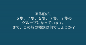 「ある船が、5隻、7隻、5隻、7隻、7隻のグループになっています。」 数字をよく読んでみると答えが、、、? 今回ご紹介するのは脳トレクイズです。 問題 : ある船が、5隻、7隻、5隻、7隻、7隻のグループになっています。 さて、この船の種類は何でしょうか? Google ADVERTISEMENT Google あなたはわかりましたか? それでは答え合わせに行きましょう! Google 答えは、、、「タンカー(短歌)」 ADVERTISEMENT 船のグループが、「57577」という短歌の文字数になっています。短歌だけに「タンカー」が答えになります。 ADVERTISEMENT Google あなたは間違えずに解けたでしょうか! Google [著作権者VONVON /無断コピー、無断転載および再配布禁止(違反時の法的措置) ADVERTISEMENT