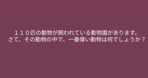 一番偉い人のことを「王様」と言います。110匹の中の王様ですので、略して「百獣の王(110の王)」です。百獣の王と言えば「ライオン」ですので、これが答えになります。