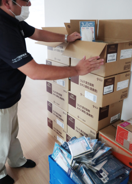 医療や介護の事業者らでつくる「なごや高齢者見守りネットワーク(みま~も名古屋)」が主催し、15日から回収活動を行っているキョーワ薬局御器所店(名古屋市昭和区)。29日、マスクを必要とする介護施設や障害者施設などへの発送に向け、仕分けや検品、箱への詰め込みを行いました。