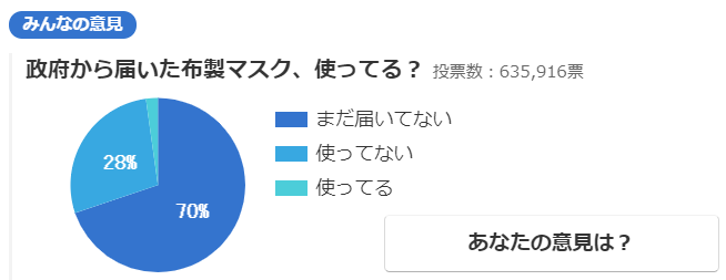 等など、様々な局面で 話題になって来た「アベノマスク」。寄付することやその活動を否定するわけではないが、多額の予算が動かされているだけに国民の間では 少なからず反感を買っていることが伺える声が多くよせられているようでした。