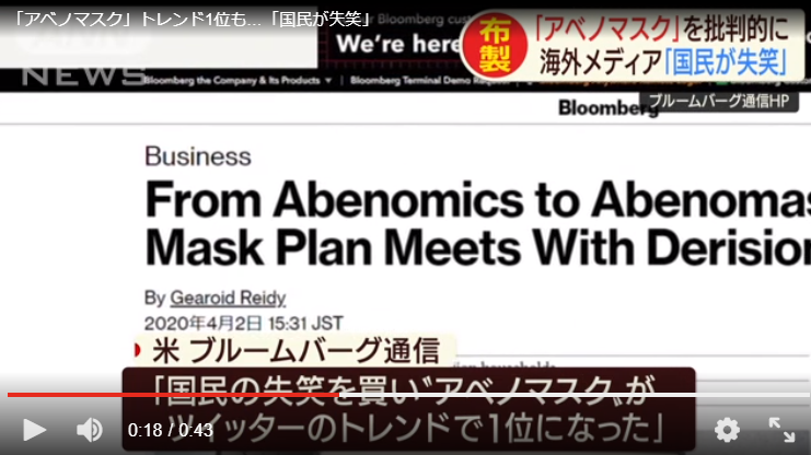 「日本の1世帯2マスクの新型コロナ対策はエイプリル・フールの冗談、アベノマスクと嘲笑さる」というタイトルで FOX NEWSも 安倍政権を揶揄しました。