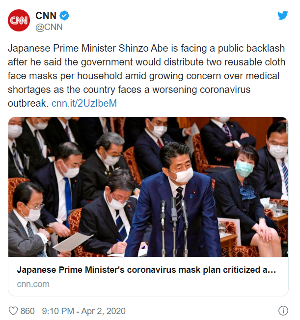 CNNは「安倍氏の1世帯にマスク2枚という提案は、ツイッターで怒りと嘲りを呼んだ」とし、さらには今月末まで、マスクが配布されないために、感染拡大を抑えるチャンスを逸するのではないかという懸念も示しています。