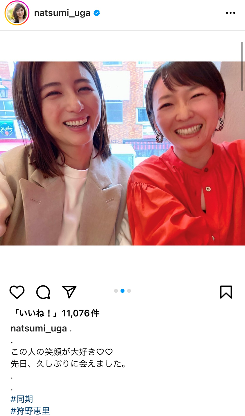 8日、元テレビ朝日アナウンサーで今はフリーとして活動している宇賀なつみが、自身のインスタグラムを更新し、テレビ東京の狩野恵里アナウンサーとの2ショットを公開しました。