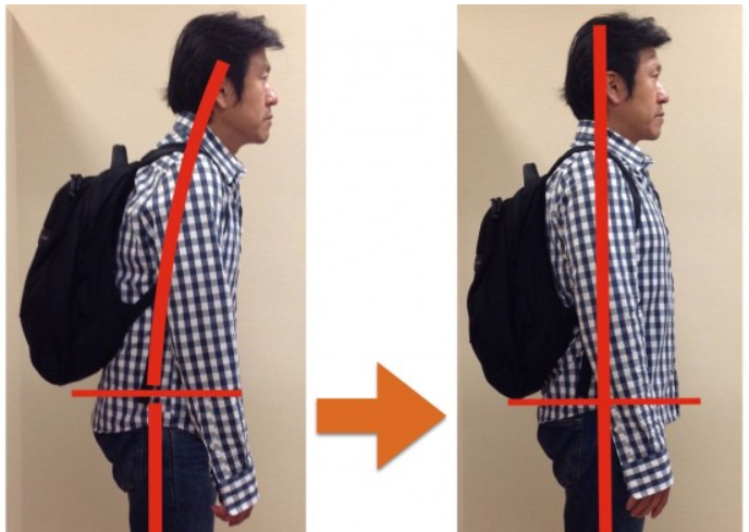 背中にリュックを背負った際に体の重心は必ず後ろに傾きます。そして、その姿勢を修正しようとして前かがみの姿勢となります。