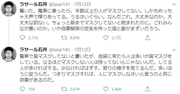 また別の投稿では、「電車で皆マスクしてないと書いたが、池袋に来たら人は多いが皆マスクをしている。なるほどマスクしない人は持ってないんじゃないんだ。してる人が多ければする。少なければはずす。周りの様子を見てるんだ。多いほうに従うんだ。つまりマスクすれば、人にマスクしなさいと言うのと同じ効果があるのだ」とし、マスクを着けるかどうかは周囲への同調意識にも関係があるのではとしています。