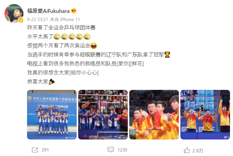 中国版ツイッターともいわれる「微博」(ウェイボー)では、まめに更新しているそうで、今年9月には、中国の国体の卓球競技を見た感想として「ものすごくハイレベルだった。よく知っているコーチや選手がたくさんいた。みんなのことが本当に懐かしい」と更新。