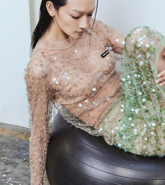 大胆な透け感が特徴的なトップスに袖を通し、全体的にキラキラとしたコーディネートを披露しました。